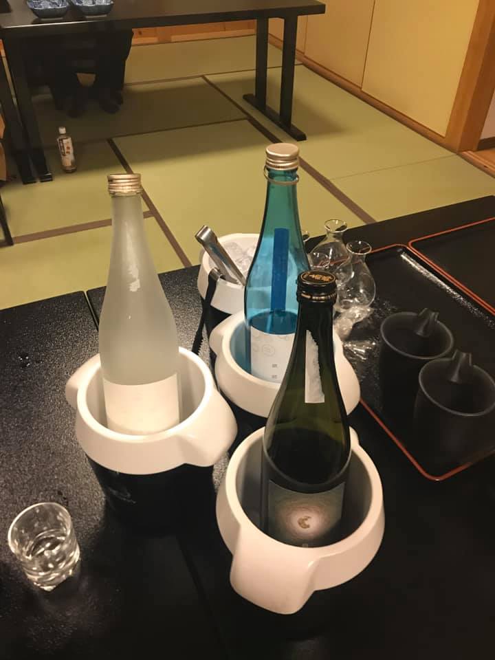上の写真で、テーブルの上にある茶色の一升瓶がやわらぎ水です。特別に南郷の仕込み水を分けていただき、やわらぎ水にさせていただきました。