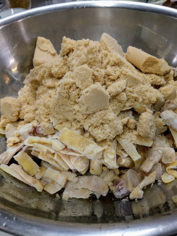 冷凍生姜の皮にたっぷりの砂糖をかける
