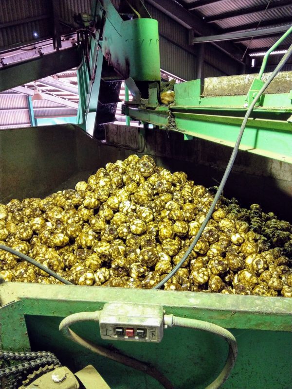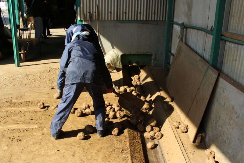 畑から掘り出したばかりというような土だらけのこんにゃく芋がベルトコンベヤーで運ばれていきます。