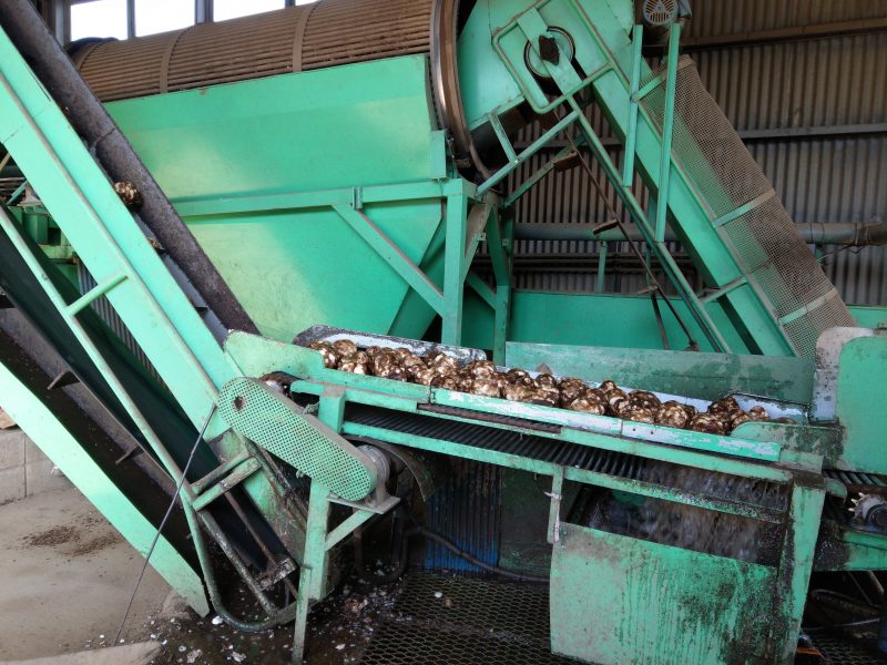 - 洗われた芋。右側で水と分けられて左上部に流れていく。奥は外からのコンベヤから土落としの過程に進むライン。