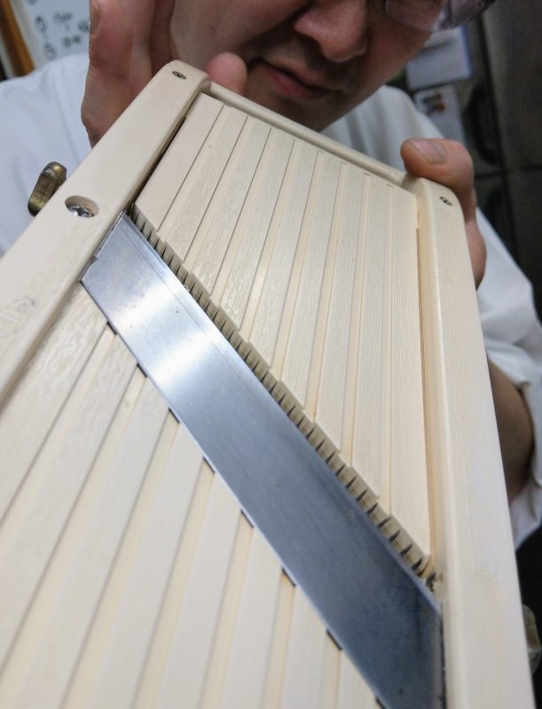 工場を案内してくださった緑川さんが、ちょうどスライサーから外されていた刃を見せてくれました。