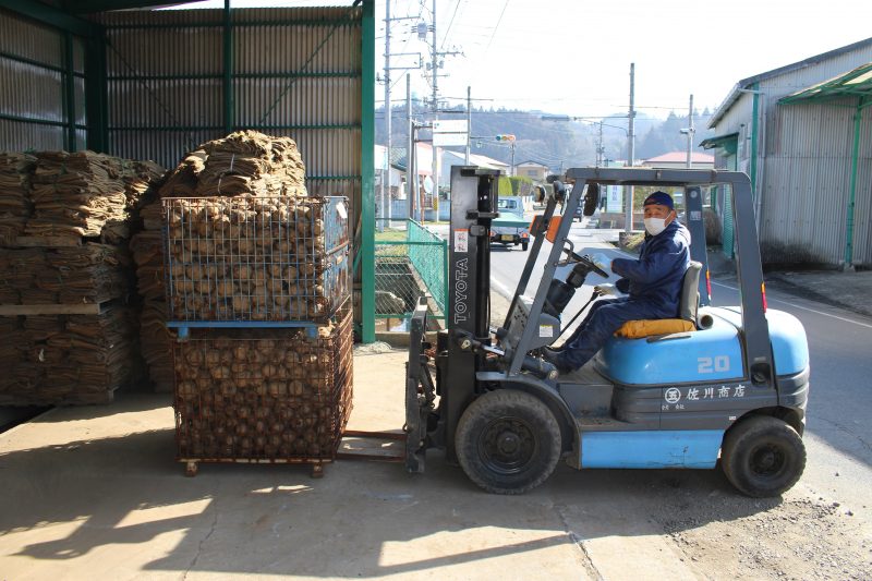 袋に詰めた荒粉を、その後道路向かいの製粉所に再びフォークリフトで運びます。