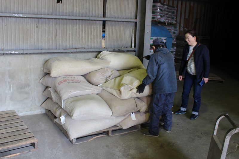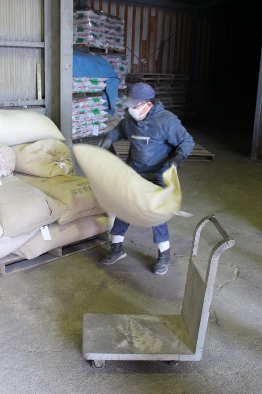 一袋30kgずつ袋に詰められます。従業員さんが慣れた手つきで台車からくるっとおろし…