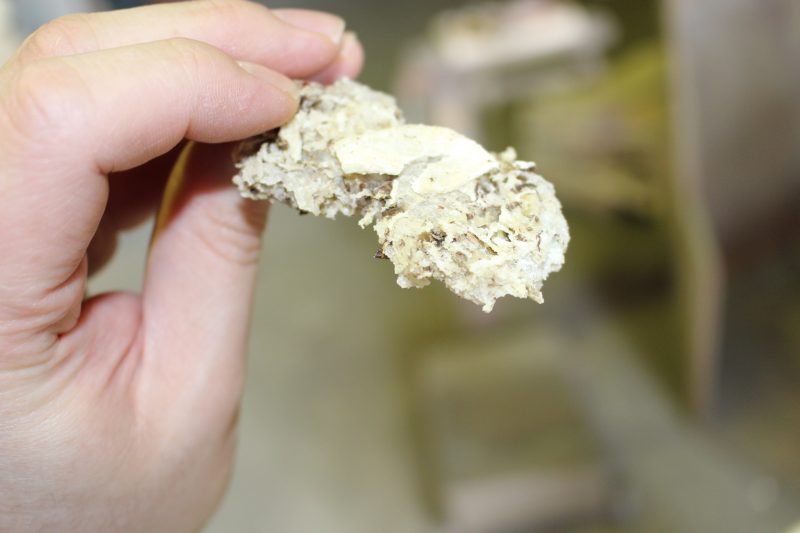 「これはね、スライスしたときに出た「ノリ(こんにゃく芋から出る粘りのもの)」が乾燥したものです。