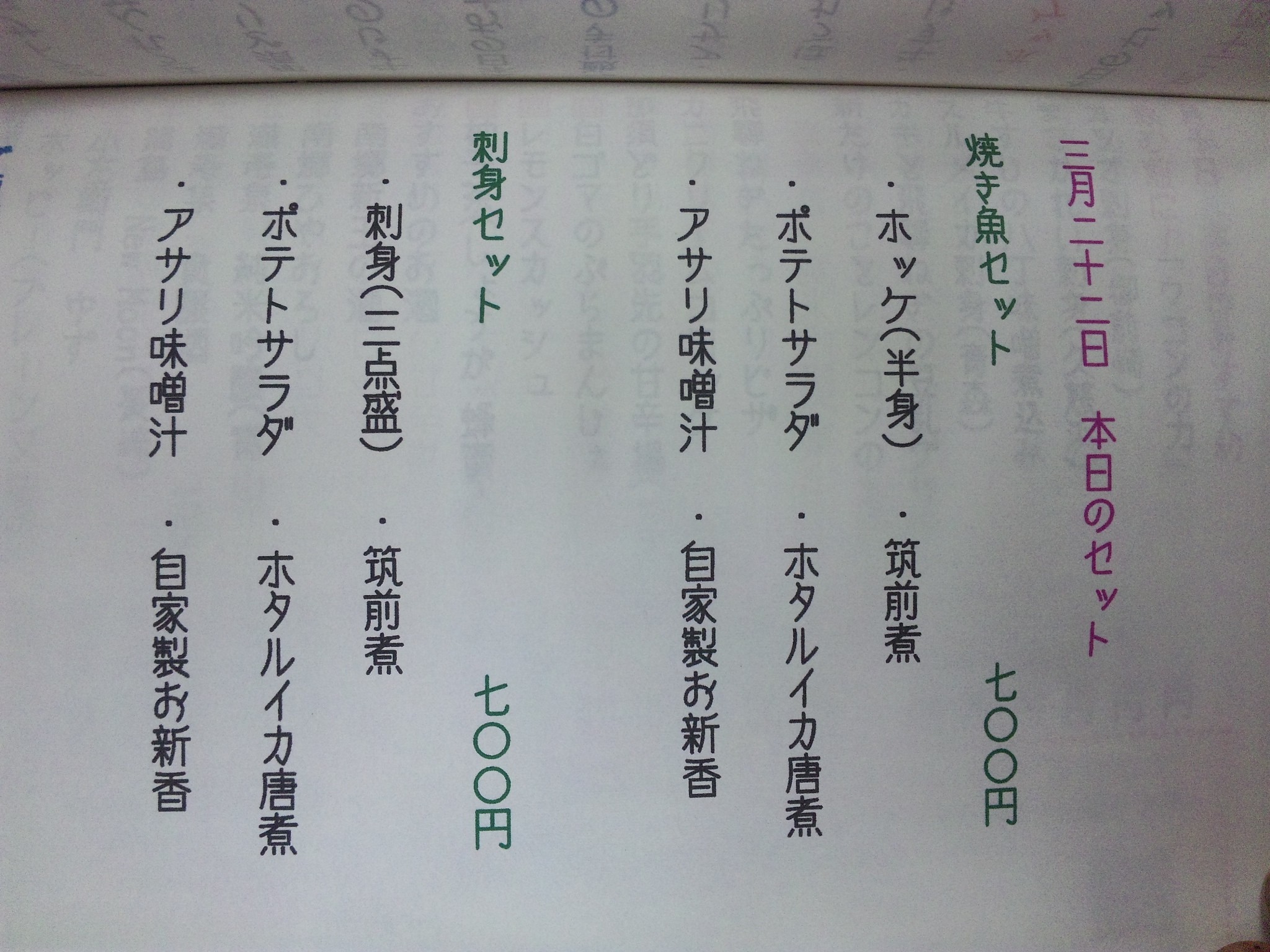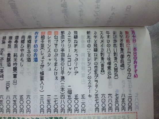 真ん中のおすすめメニューは、震災の前日3/10のもの。