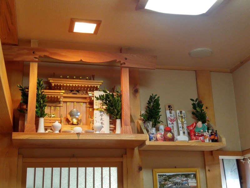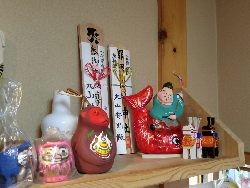 娘の誕生祝に頂いた佐賀県能古見の申の土鈴と、今秋出かけた高柴デコ屋敷の高柴木馬や張り子人形なども飾りました。