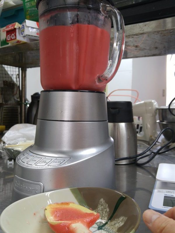 - たっぷりなイチゴをジュースにしてから使います。つぶつぶも残ってます。
