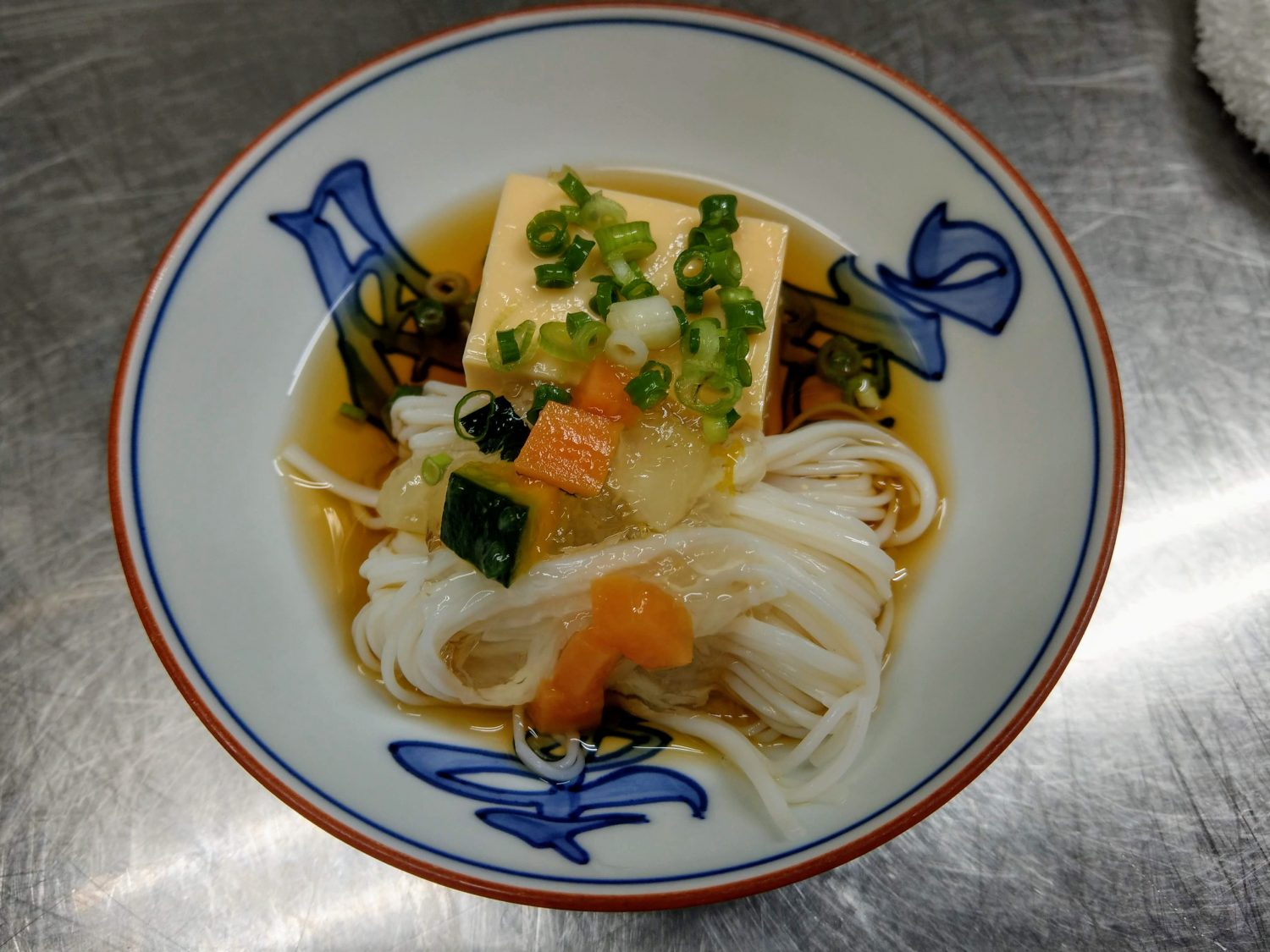 今日のおすすめは、そんな中で「お通し」。手製の玉子豆腐とそうめんの小鉢です。