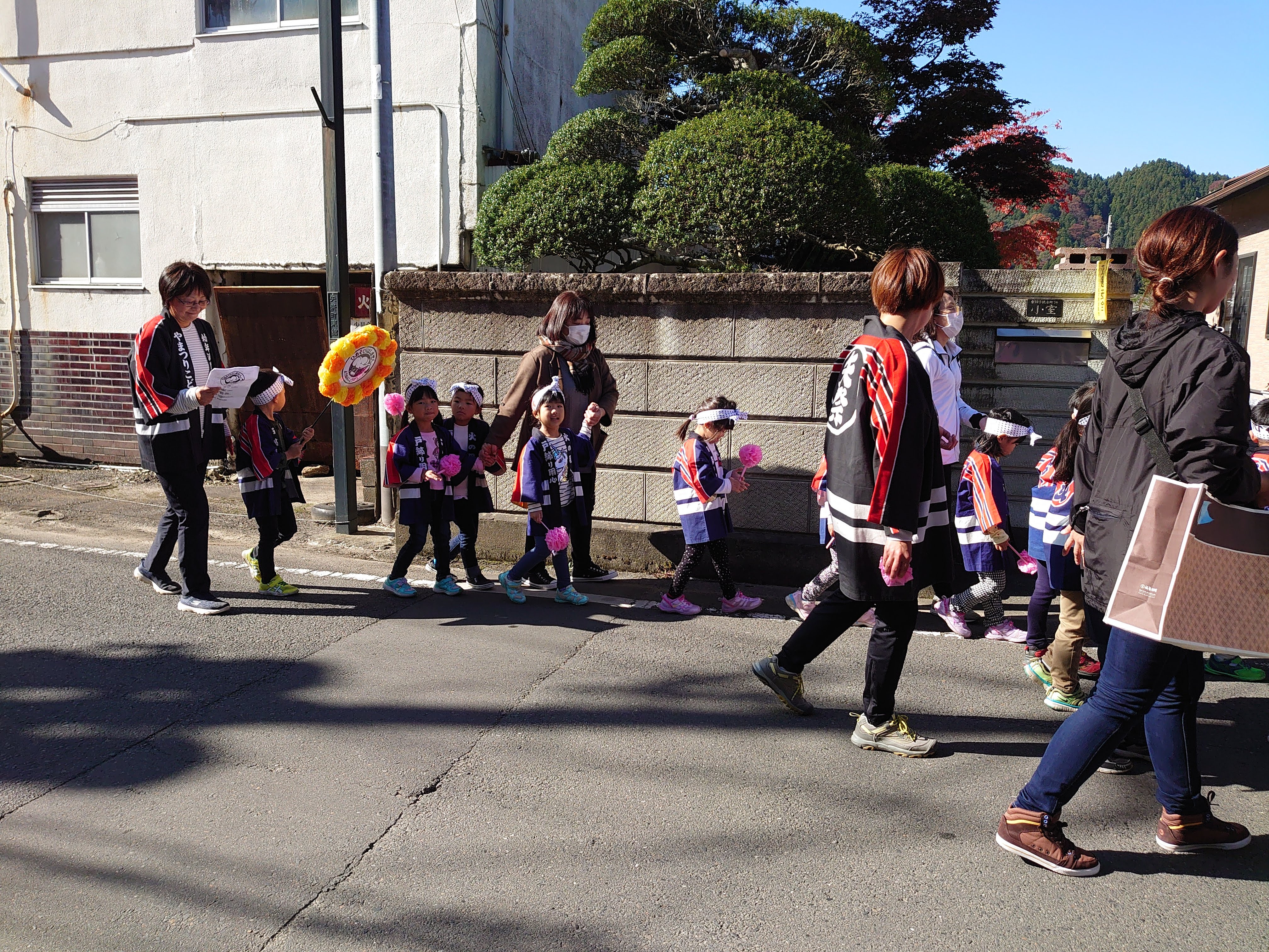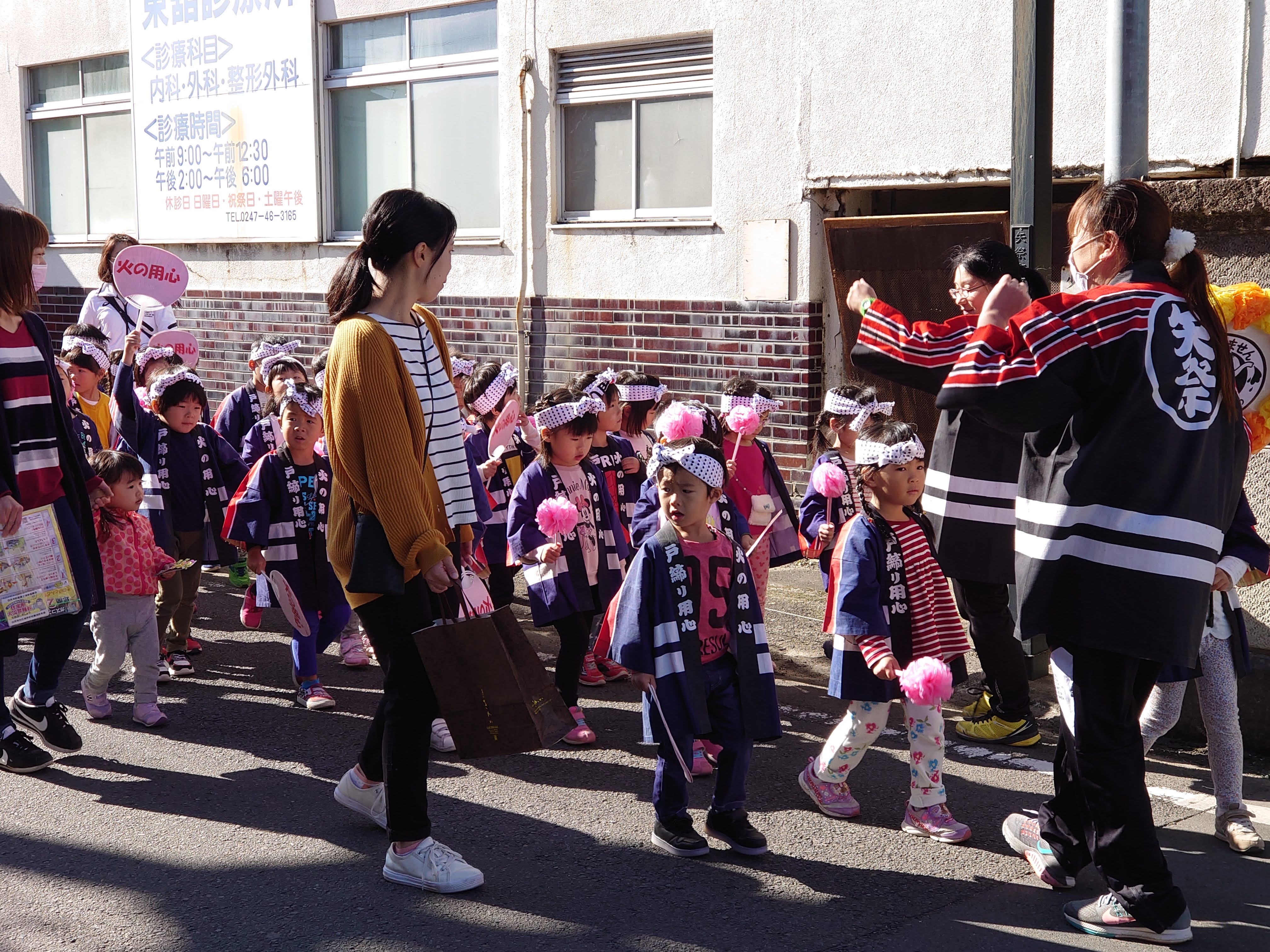 小さな子どもたちがかわいい法被を来て、「マッチ一本火事のもと」と言いながら歩いていきました。