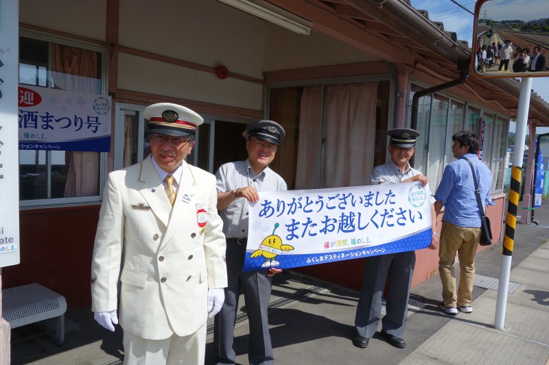 今日は郡山から当店直近の東館駅までの往復ツアーがあり、車内では矢祭の地酒「南郷」が振舞われたり、