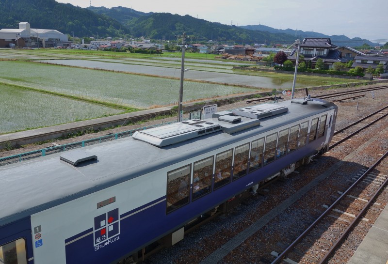 - いつもは蒼い海を見ながら走る列車が、今日は早苗で緑に染まる田んぼの中を走る!