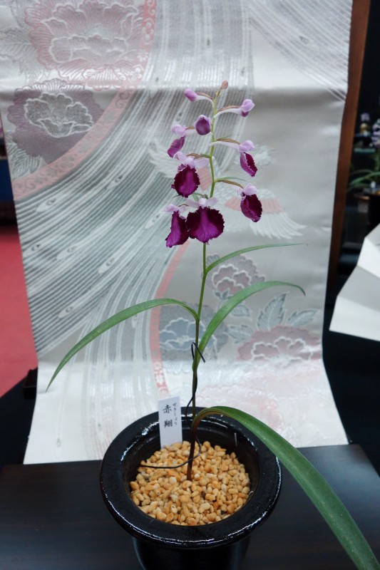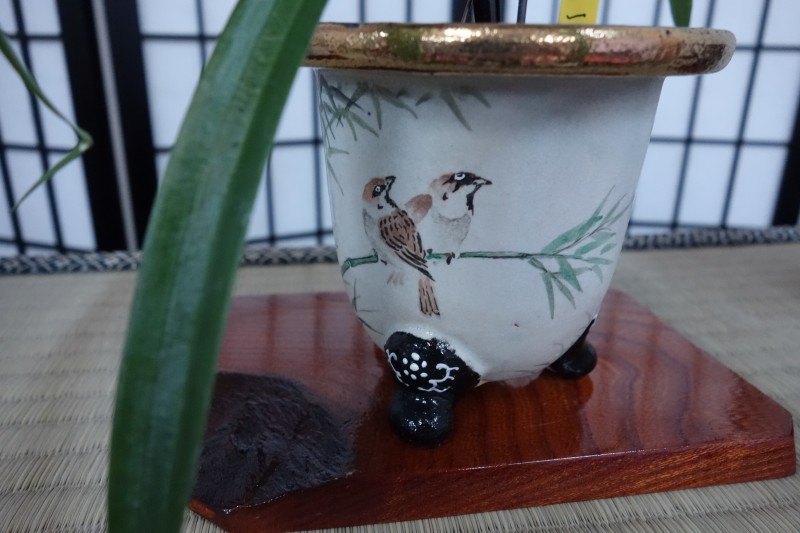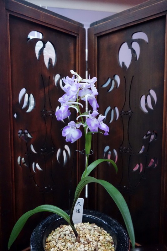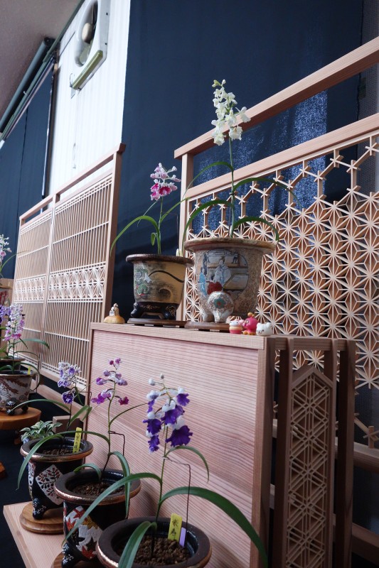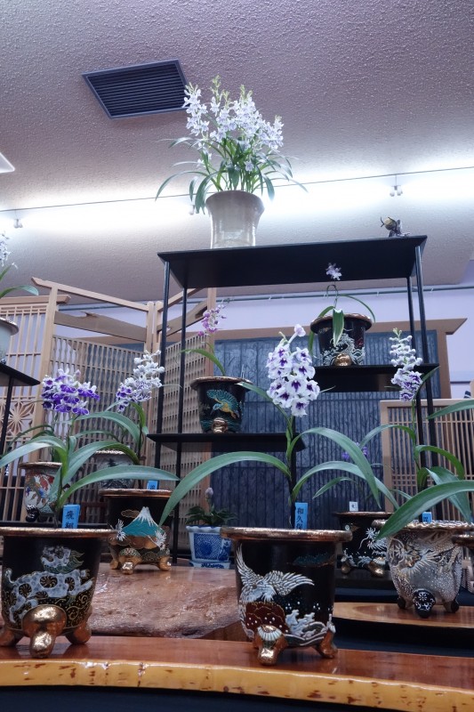 丹精込めて育てたウチョウランの見事さはもちろん、見事な絵付けの鉢、展示用の棚や衝立、鉢台、花を引き立てるための様々な飾りつけ。