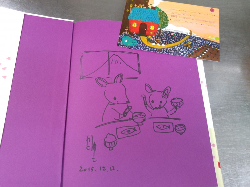 更に図々しくもサインをお願いしたところ、さかな家と言うことでご飯をおいしそうに食べているところをさらさらと描いて下さいました。