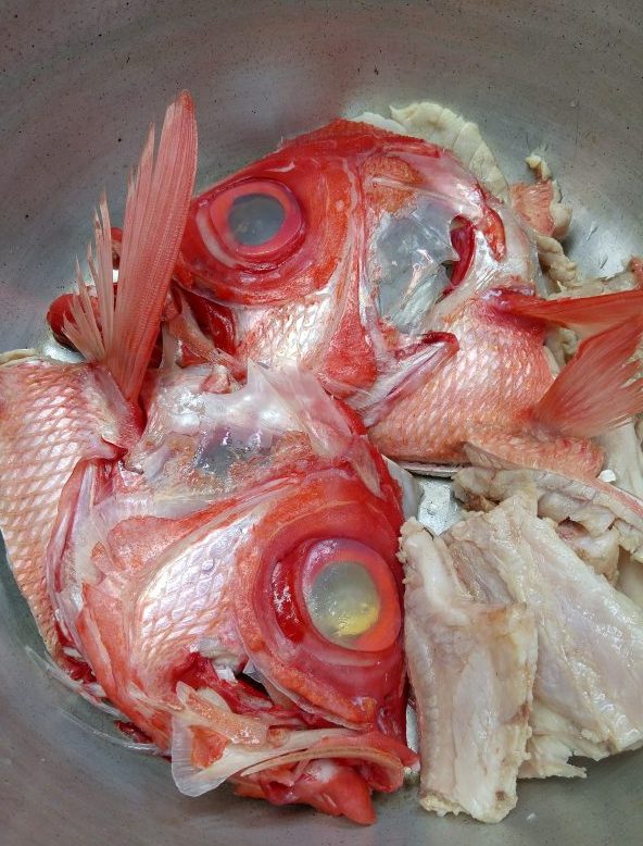 煮る前の金目のカブト。綺麗な緋色と金の目です