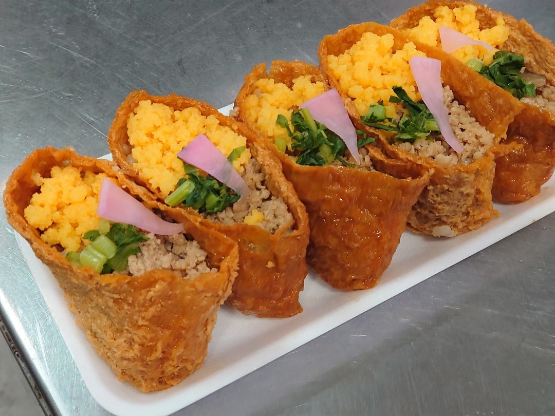 酢飯に店主特製のちらしずしの具(かんぴょう、ゴボウ、高野豆腐、ニンジン、しいたけなど)を混ぜ込みそれをおいなりさんに。